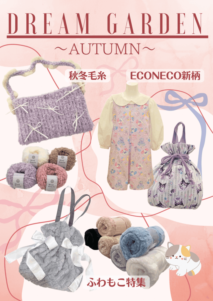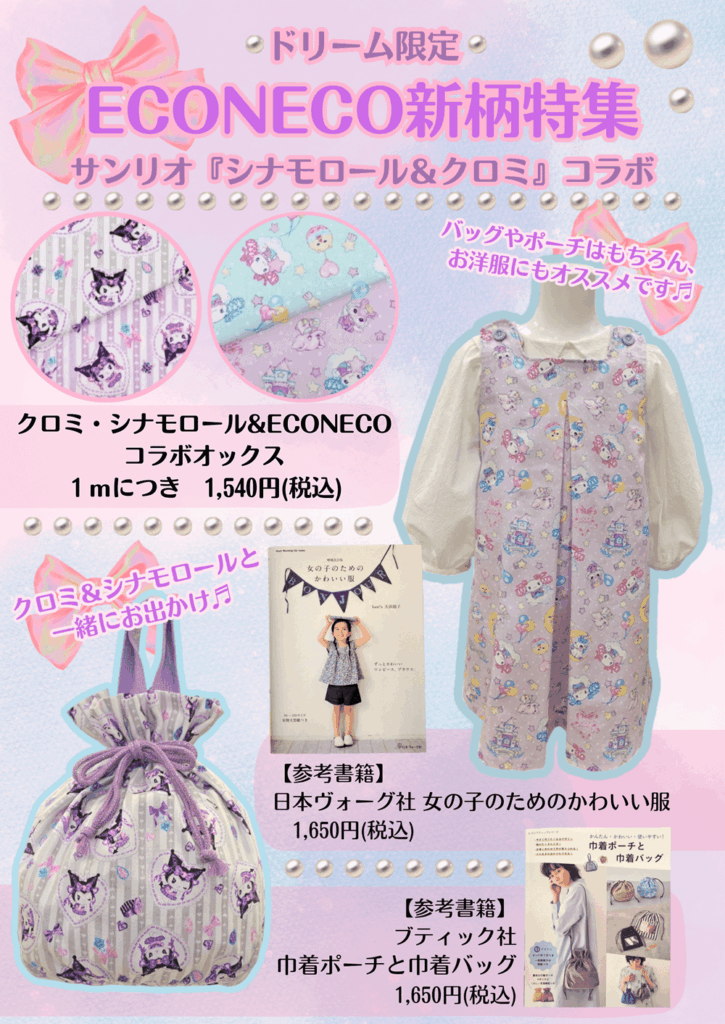 ドリーム限定販売・作家ブランド生地『ECONECO(絵子猫・エコネコ)』とサンリオ『シナモロール・クロミ』コラボ生地の登場です!